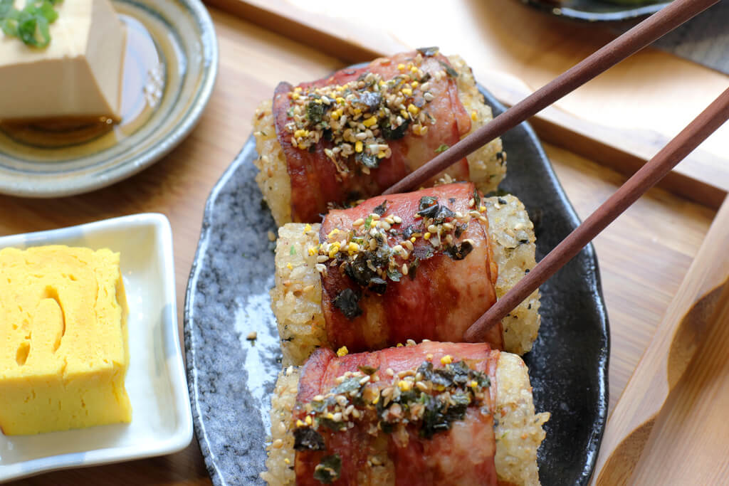 ▼培根捲捲 $160/ 飯糰皆附季節沙拉、漬物、家常菜2種