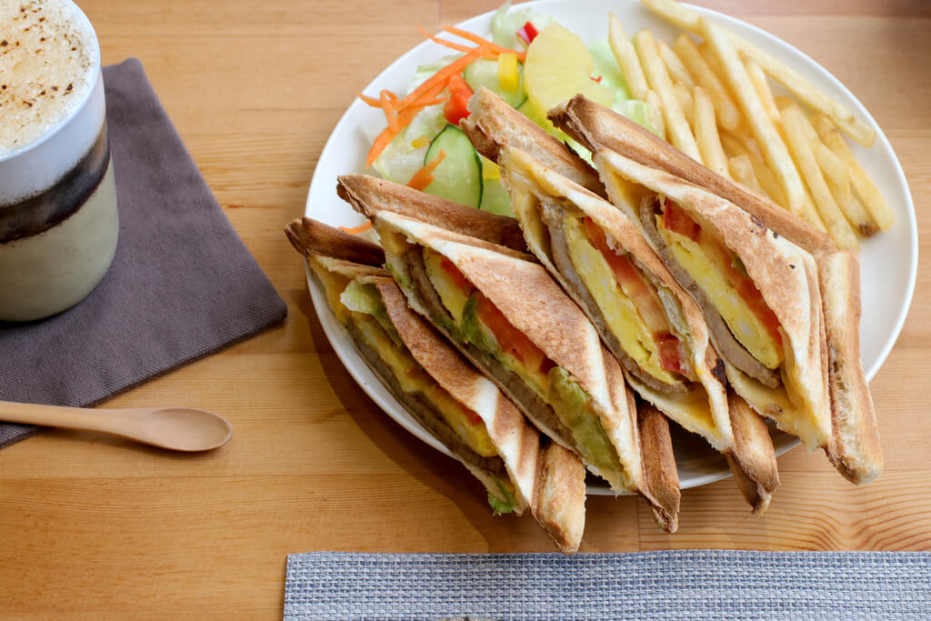 熱壓吐司邊邊是令人喜歡的脆脆口感,咬著內餡紮實的口感,裡面夾上土番茄切片、黑胡椒豬排肉、生菜、起司和蛋,口味清爽,份量也相當足夠,一旁的薯條因拍照的關係,溫溫吃覺得口感較乾,建議一上桌就享用。