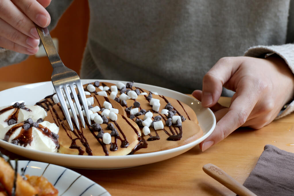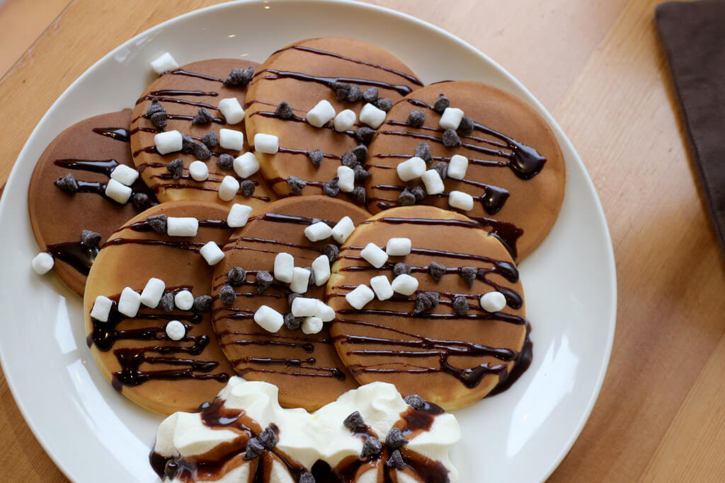 一整份有七塊鬆餅,紮實的口感,餅皮綿密微香,還藏了巧克力豆豆在裏頭,咬著更富口感,沾點鮮奶油一起,在嘴裡更輕盈香甜,也是店內必點的招牌甜點。
