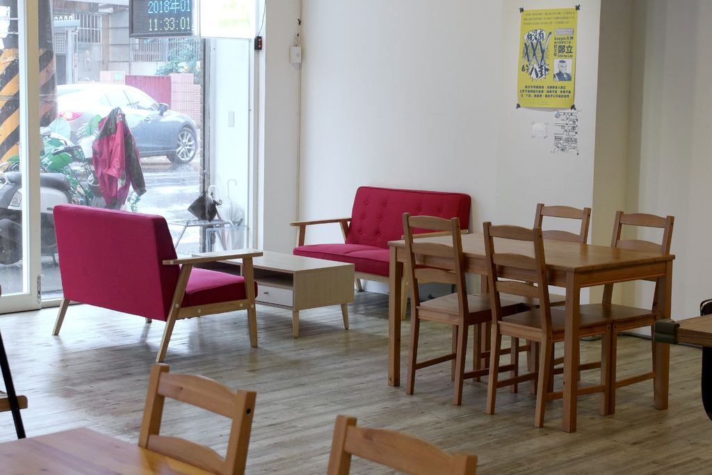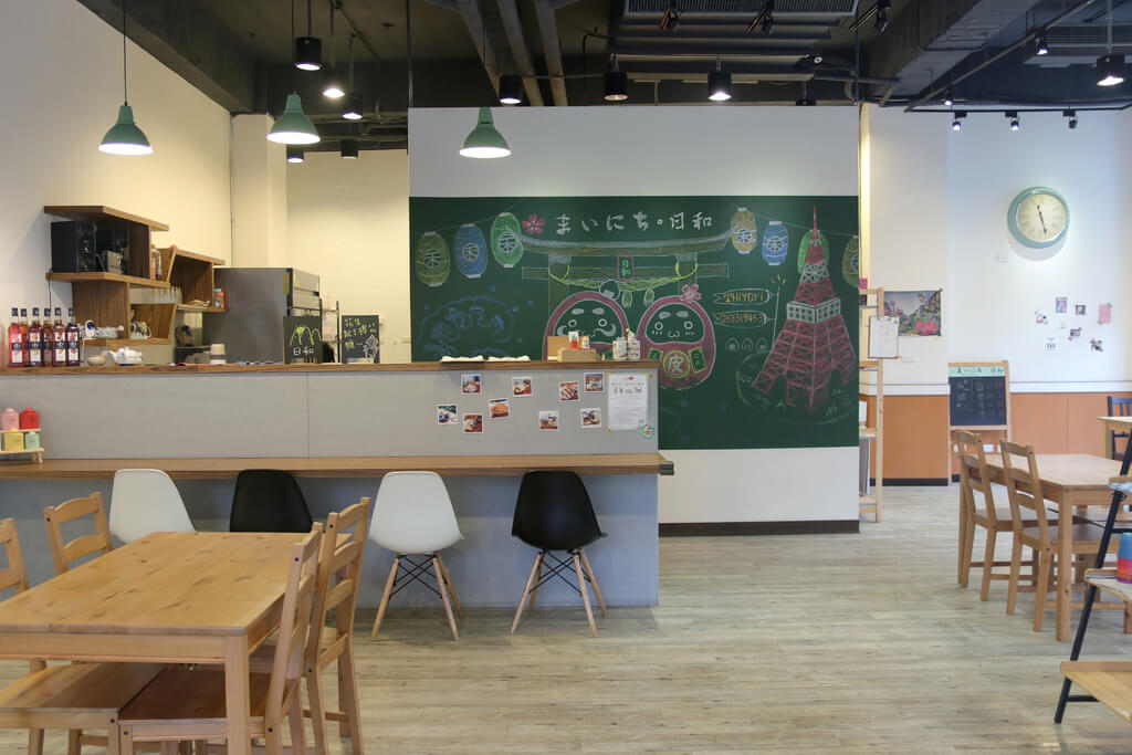 日和 . まいにち位於桃園區民富三街1號巷內街角的位置,內部挑高舒適的空間,帶著些許日式居家的風格,簡單的木頭桌椅擺設,是寬敞的桌距,也提供簡單茶水自取。