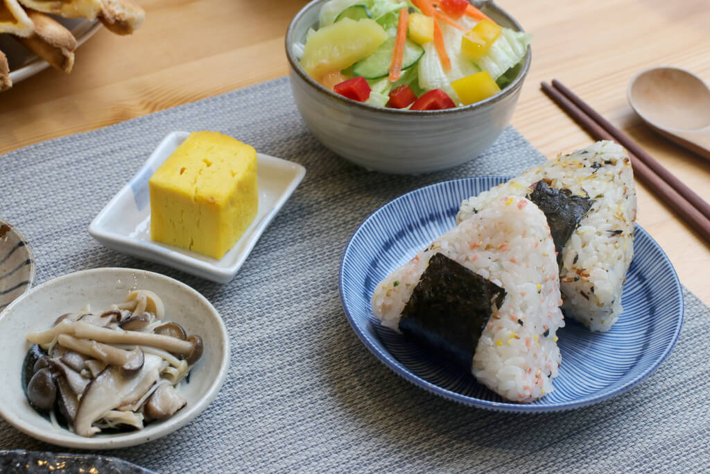 端上桌時,店主冠全先將餐墊放置於桌上,接著再將一疊一疊各種色調的配菜與主食飯糰依序擺上。一整份飯糰定食,看起來豐盛,精心的擺設也相當吸引人。