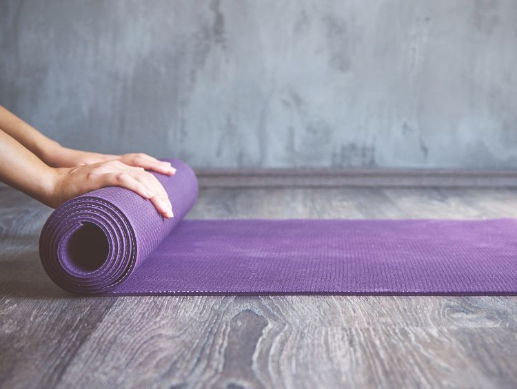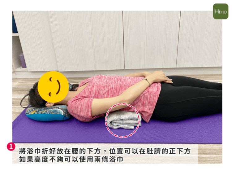 首先先找一條較長的浴巾,然後折成一半,然後再折一半,也就是一共 4 折。折好之後人躺在瑜珈墊或是地板上,將骨盆枕放在腰部下方,雙腳伸直。