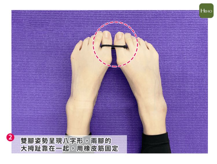 雙腳伸直的同時,要將腳趾頭併在一起,大拇趾趾尖倒向內側,雙腳姿勢呈現八字形。