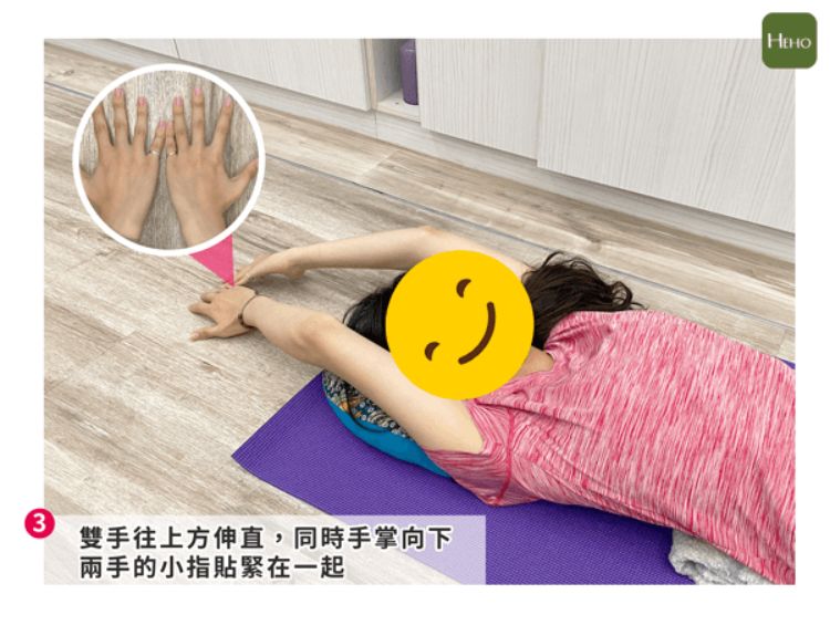 然後伸展你的雙臂至頭上,手心向下,且兩手的小指貼緊在一起平躺。