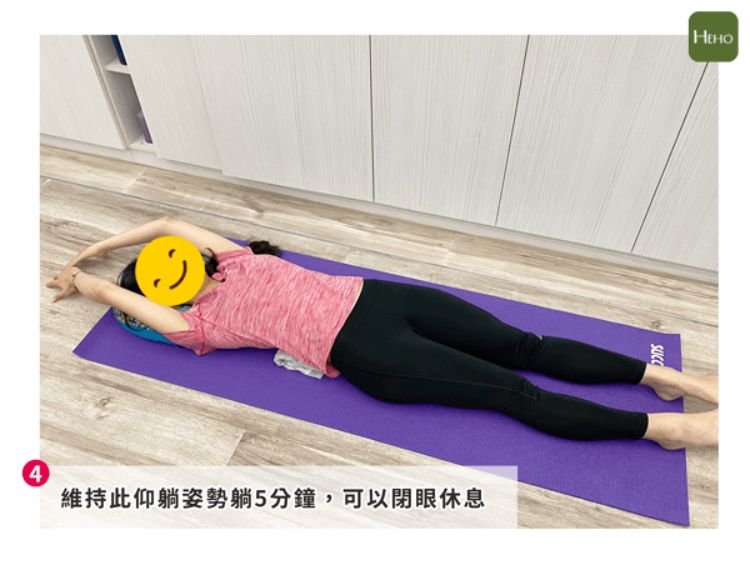 維持此仰躺姿勢躺 5 分鐘,可以閉眼休息。