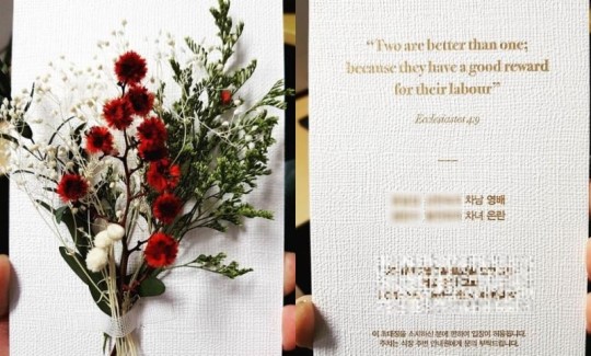 上週太陽與閔孝琳喜帖被同公司前輩1TYM宋栢京在IG曬出,簡直就是閃瞎單身狗!喜帖以設計感十足的紙質鑲上金色字體的喜訊,上面引用《傳道書》的文字:「兩個人比一個人更幸福,勞碌同得美好的報酬」(Two are better than one, because they have a good return for their labor.),背面則是白色、紅色交錯的乾燥花束點綴,光從喜帖就能看見優雅清新的氛圍。