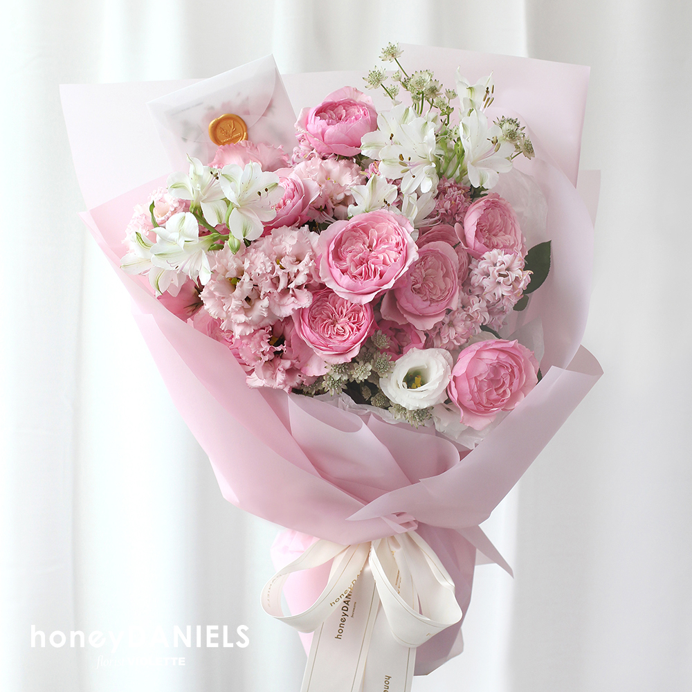 羅賽蒂「雖然我先愛妳」:鋪陳優雅和諧的粉白漸變印象。田園玫瑰,粉風信子、白水仙百合、白芨與粉桔梗,彷彿戀愛的溫度把戀人們的日常融化成一幅莫內的印象畫。