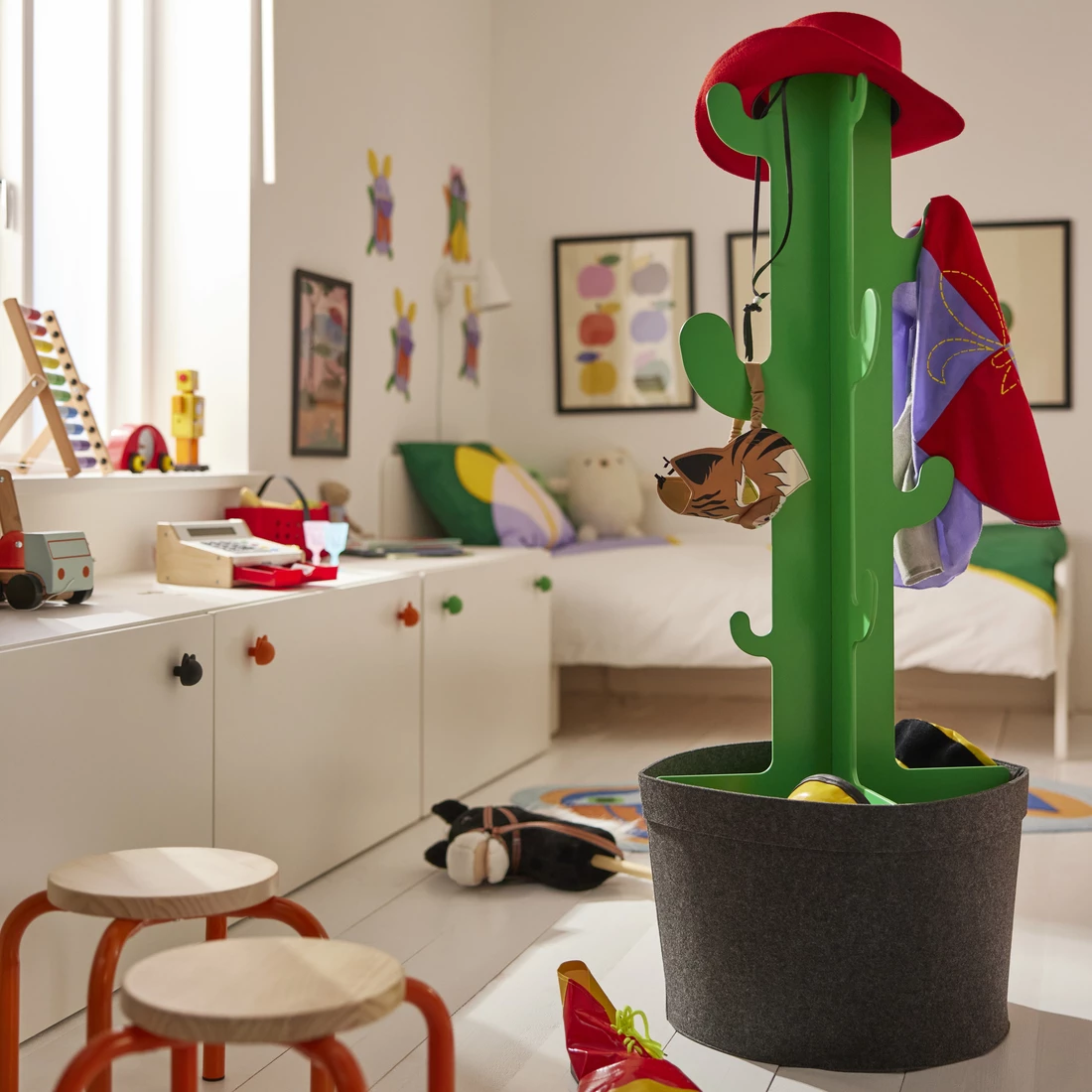 高度125公分的「衣帽架」專為孩子設計,讓他們能自己掛衣服、收納小物。掛鉤設計像是在幫植物澆水,底部盆栽分成四格,襪子、貼身衣物各自歸位,整理就像在照顧一株植物,讓孩子在日常中學會分類與責任感,把收納變成參與感十足的儀式(NTD1,799)。