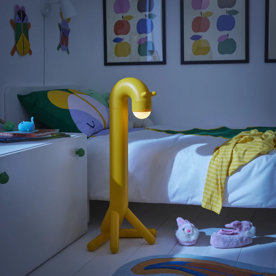 明亮鮮黃的「長頸鹿造型地燈」,一眼就能抓住孩子與大人的目光。長頸鹿坐著的燈腳設計穩定又可愛,搭配修長、微微彎曲的脖子比例,童趣中帶點設計感,不會過於幼稚。最療癒的是輕拍開燈的互動方式,像是在跟長頸鹿打招呼,頭部還能左右旋轉,調整角度時彷彿牠真的在轉動脖子。燈光柔和不刺眼,非常適合放在床邊、閱讀角或夜燈使用,為睡前時光留下一盞安心的光(NTD999)。
