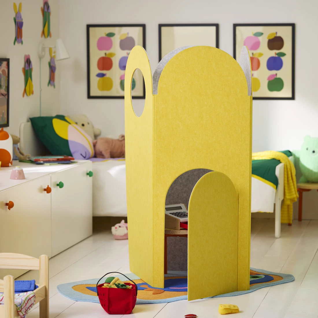 鮮黃色「隔間屏風」,以耐用毛氈布製成,門片、洞孔與可折疊設計,讓使用方式非常彈性。可以折成小屋、秘密基地,也能隔出閱讀或安靜角落。即使兄弟姊妹共用空間,也能各自擁有小天地。它不是冷冰冰的隔間,而是能跟著想像力一起變化的家具(NTD1,799)。
