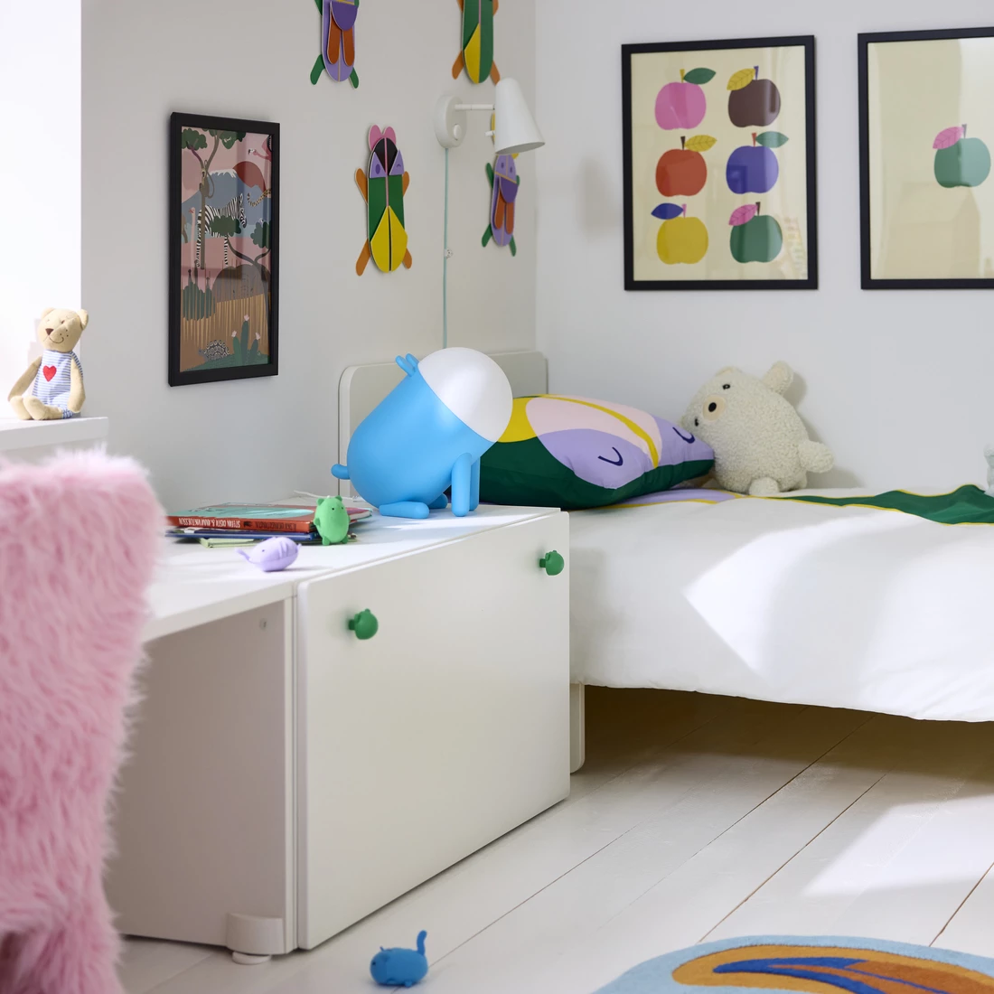 A:Grejsimojs系列主要鎖定學齡前到小學階段的孩子,但設計刻意避開過度卡通化,許多品項如燈具、收納、地毯與屏風,其實更接近「親子共用家具」。對幼齡孩子來說是玩具與互動物件;對大一點的孩子,則是能參與生活、培養收納與空間使用習慣的家具。也因此不少家長會選擇放在客廳或公共空間,而不只侷限於兒童房。