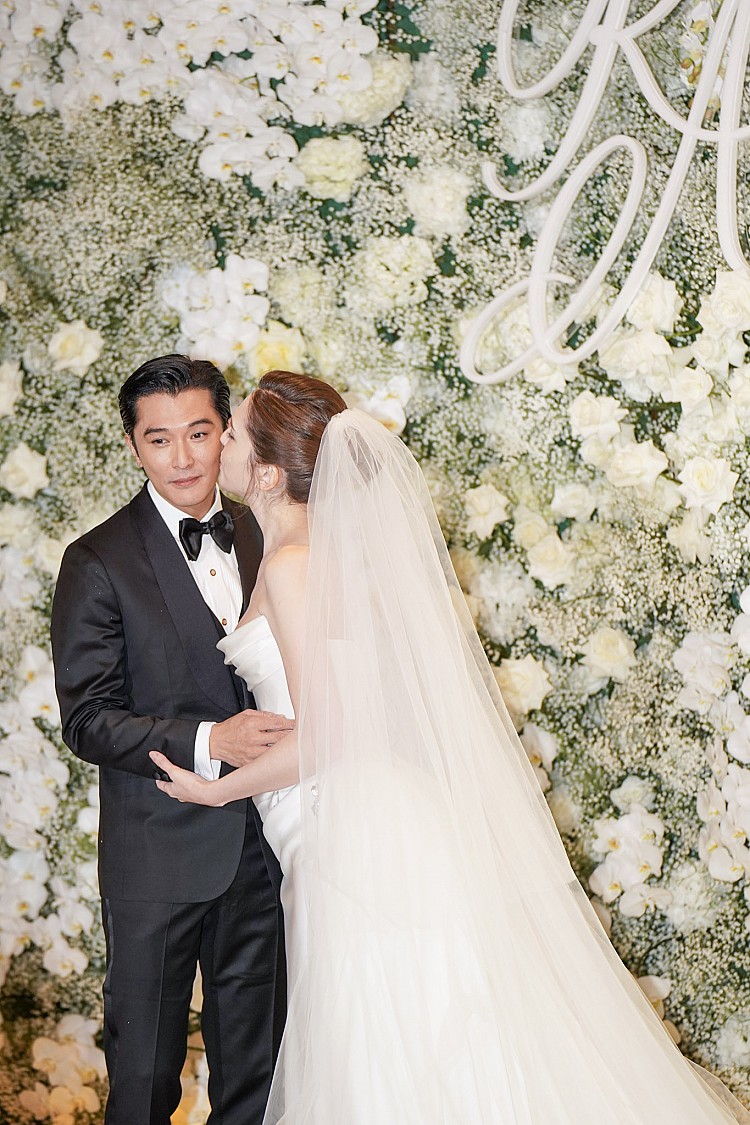 許瑋甯今日穿上Nicole + Felicia訂製的白紗亮相,以優雅線條與戲劇張力完美驚豔全場,婚紗細節也立即引發網友熱議。主禮服以柔霧象牙白為基底,特別選用帶有溫潤米調的面料,更貼合許瑋甯的膚色。上身以立體摺襇修飾肩頸線條,搭配乾淨俐落的雕塑腰身,高貴且優雅的魅力讓人眼睛離不開。