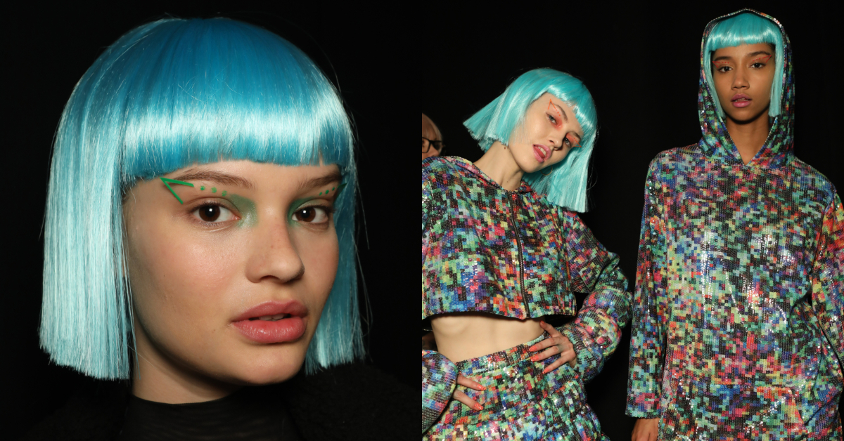 以Jeremy Scott 2018秋冬時裝秀為靈感啟發,Jeremy Scott 2018秋冬時裝秀更吹起復古風朝,重回60年代晚期最激情、最大膽的創意年代,在服裝上運用各種明亮、鮮豔色彩的閃亮材質色塊拼接,髮型則是以輪廓俐落、鮮明搶眼的冰藍色假髮呈現,宣示大膽前衛、無所畏懼的時尚態度。