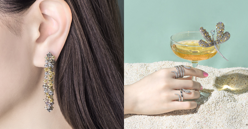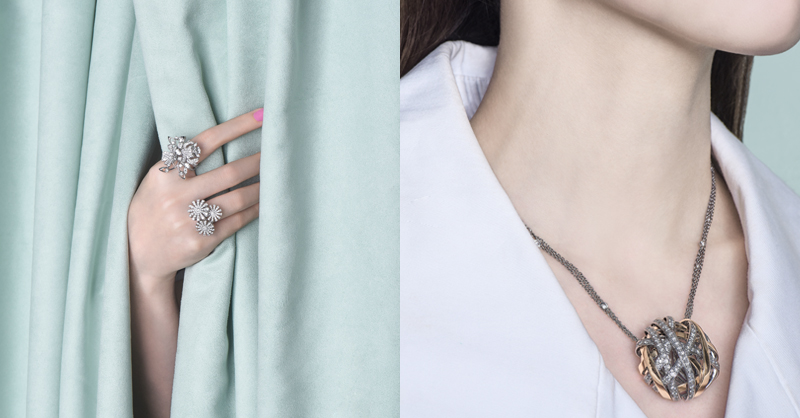 左:(食指)Fiori D'Arancio 白金鑲嵌鑽石橙花造型戒指、(無名指)Margherita 白金鑲嵌鑽石;右:Chignon 玫瑰金及白金交織鑲鑽球型項。All by Damiani