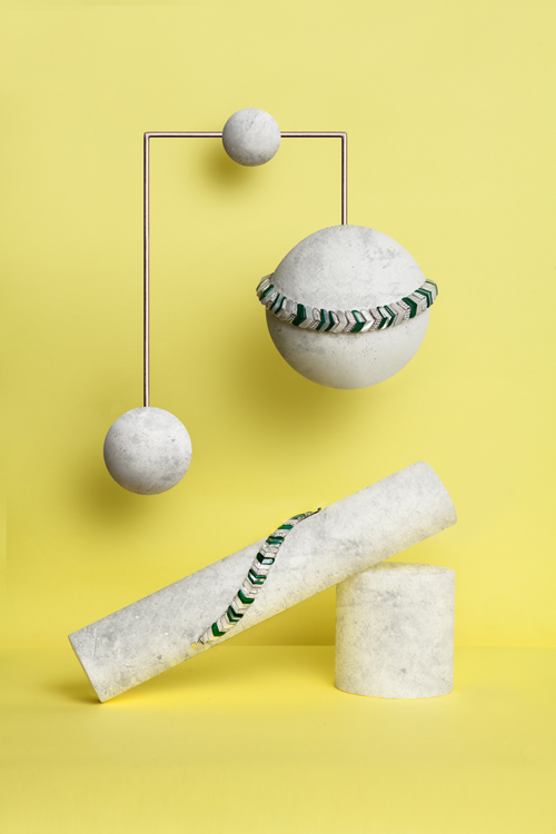 Vendôme 白K金鑲嵌鑽石、孔雀石、珍珠母貝項鍊;Vendôme 白K金鑲嵌鑽石、孔雀石、珍珠母貝手環。All by Boucheron