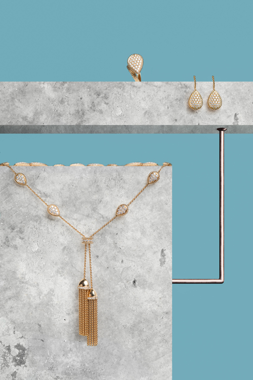 Serpent Bohème 黃K金鑲嵌鑽石水滴型設計戒指;Serpent Bohème 黃K金鑲嵌鑽石水滴型設計耳環;Serpent Bohème 黃K金鑲嵌鑽石水滴型設計流蘇項鍊。All by Boucheron