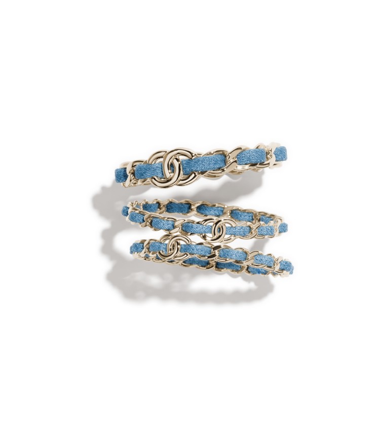 淺藍色丹寧材質的運用在金屬皮穿鍊上,讓整體配色輕盈了起來,這個簡潔俐落的寬手環配飾,因為有三層疊戴的樣式,讓搭配性變得更強、更百變!(價格:NTD54,300)