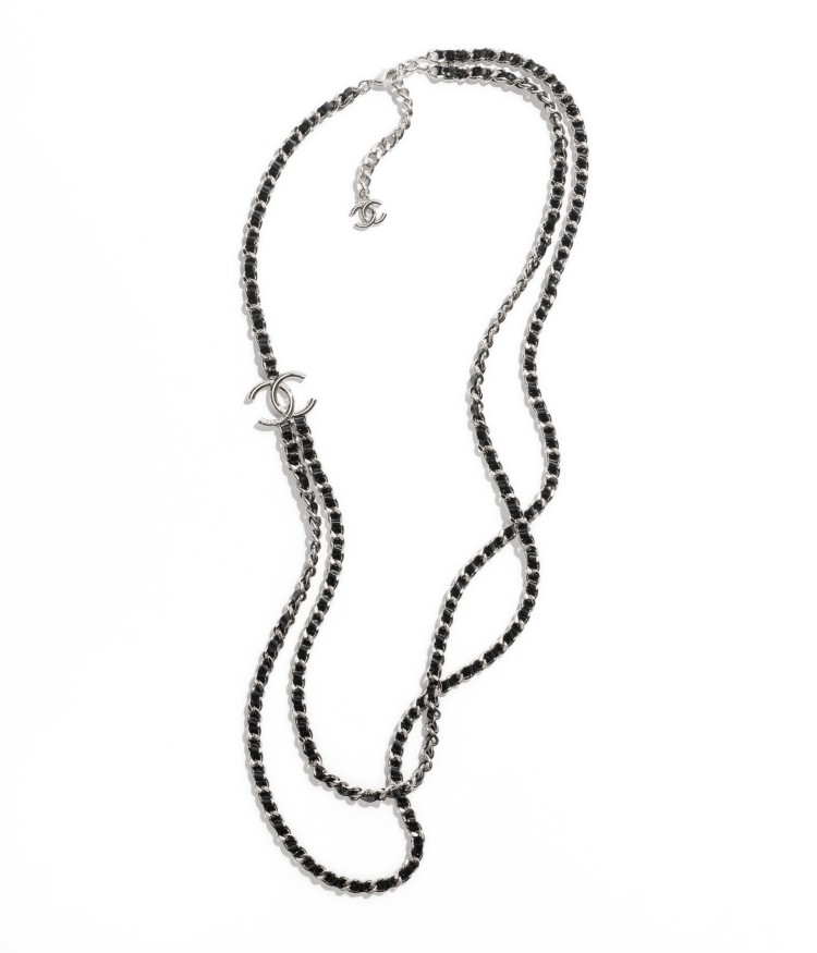 銀黑色皮穿鍊雙C logo層次長項鍊