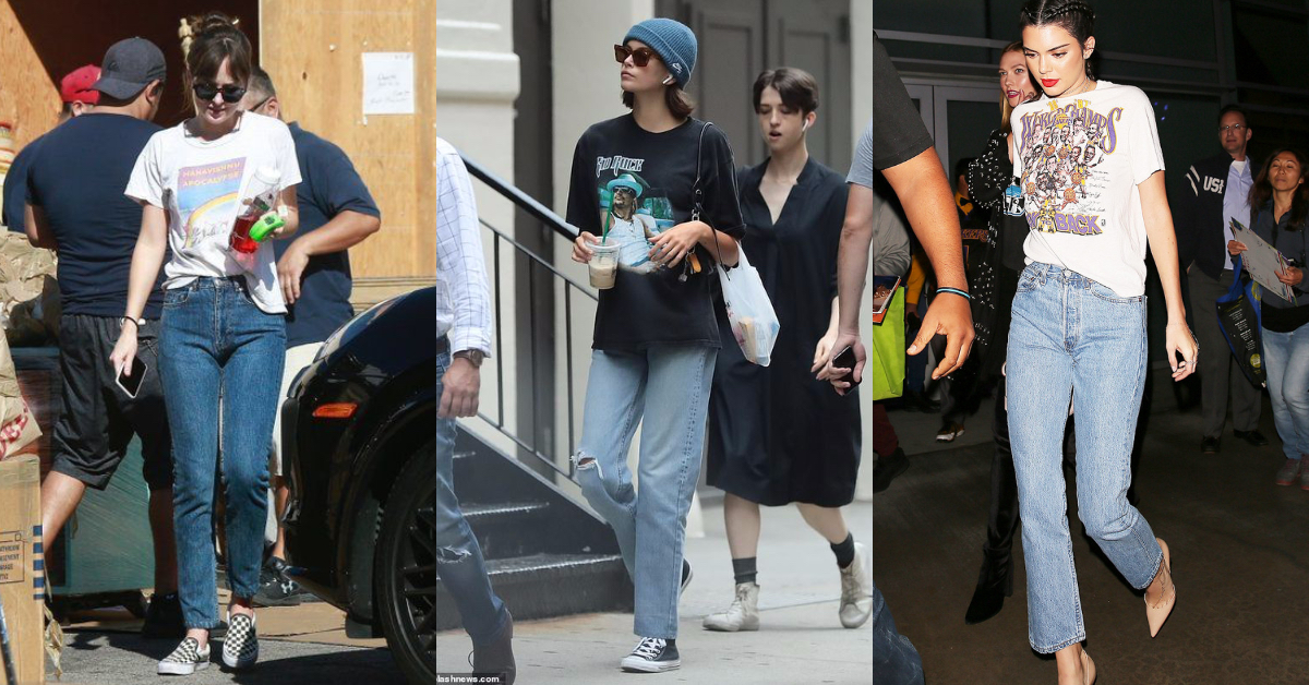 復古高腰的「Mom Jeans老媽褲」,一直許多歐美女星的必備單品之一,不論是《格雷》女主角Dakota Johnson(左)、超模Kaia Gerber(中)跟Kendall Jenner(右),私底下都愛穿!搭配復古T,紮不紮進褲頭都相當有型,腳下踩雙帆布鞋或是高跟鞋,都十分時髦好看!不需要過多的裝飾,簡單的造型配上墨鏡,態度拿出來,你也可以是好萊塢大明星!