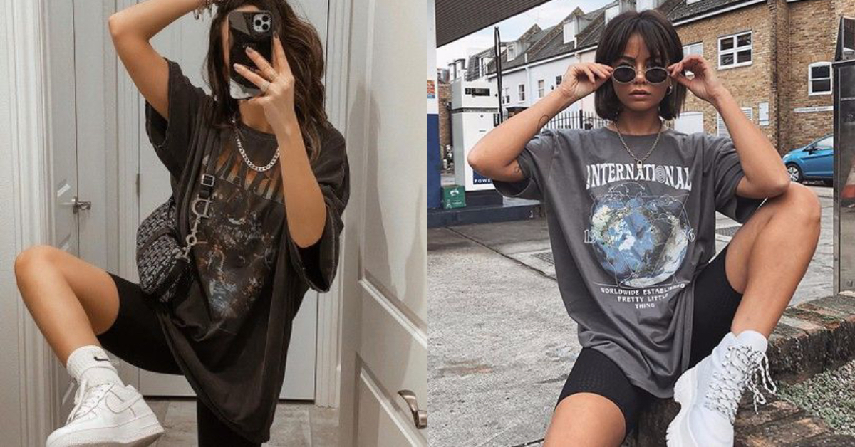 今夏超流行的單車褲材質貼身、顯曲線,對許多女孩來說是相當大膽的穿衣風格,也因此不敢輕易嘗試,但若搭上寬鬆的復古T恤,整體而言就沒那麼難駕馭,寬大的T恤能夠幫你遮住屁股,配上白鞋跟2020最夯的腋下包,穿起來有種隨性的時髦態度。過不久即將入秋,上身搭配大學踢也合適,女孩們別怕害羞,勇敢嘗試吧!