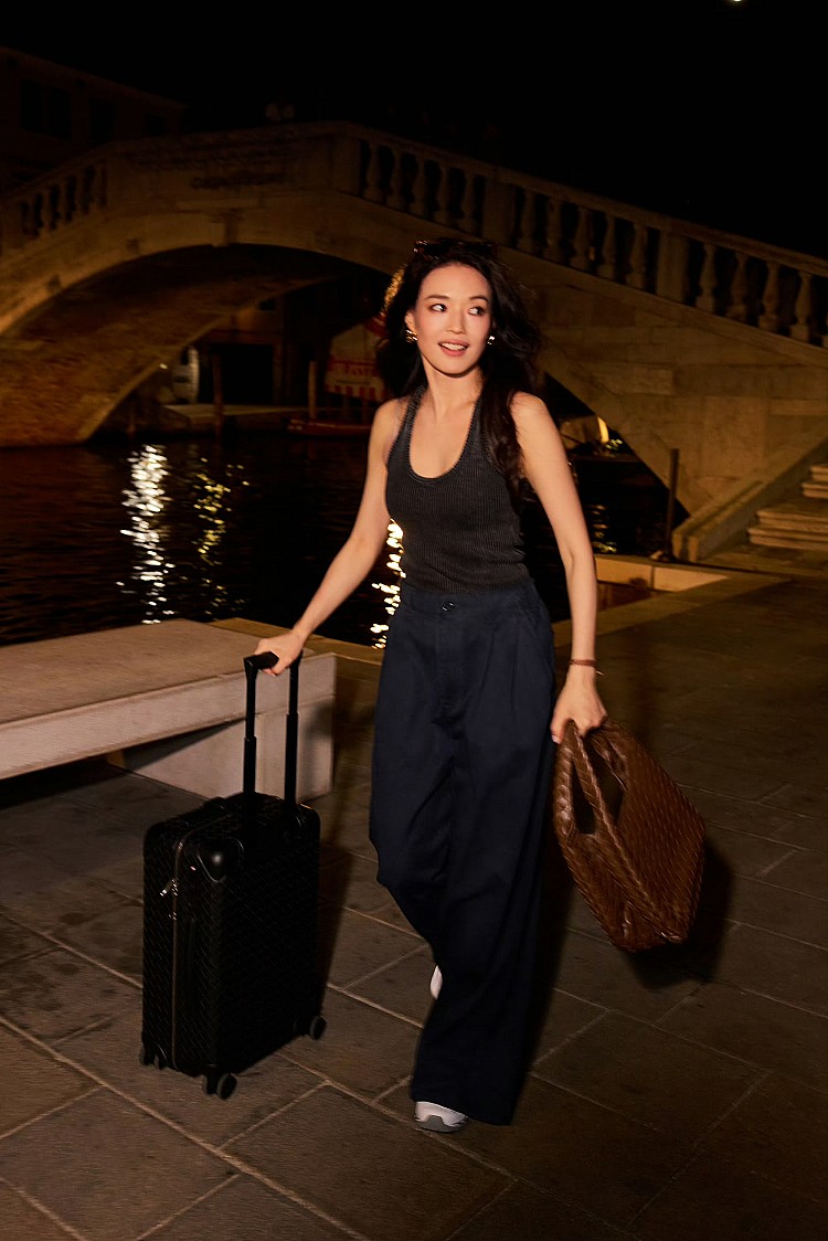 舒淇減齡穿搭上精準掌握露膚程度,以休閒率性的造型現身威尼斯街頭,穿簡約的Ganni深灰色背心,搭配Bottega Veneta海軍藍寬褲,落地的版型讓視覺身高加長,腳踩白色Salomon運動鞋,手上則拎著BV最新的Campana編織包,隨性之中卻不失高級感。