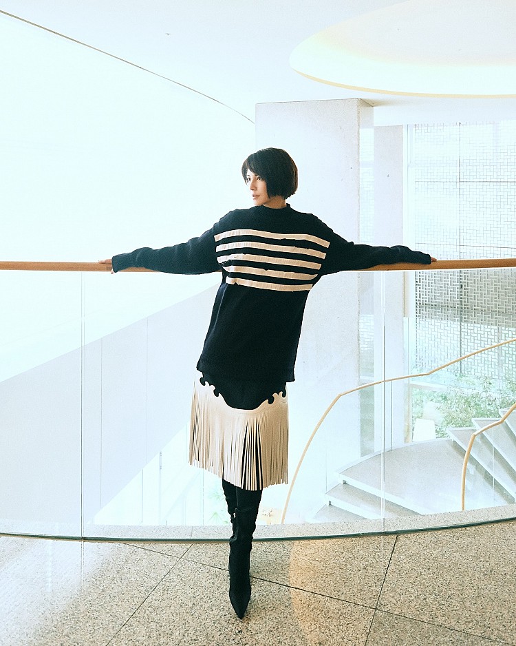 寬鬆的條紋毛衣的穿搭讓人一秒變成大學生!李心潔以Prada條紋毛衣搭配奶白色流蘇裙,柔軟針織結合流蘇搖曳的律動感,再加上長靴拉長腿部比例,視覺上瞬間顯高又顯瘦,讓整體造型既輕盈又具層次感。
