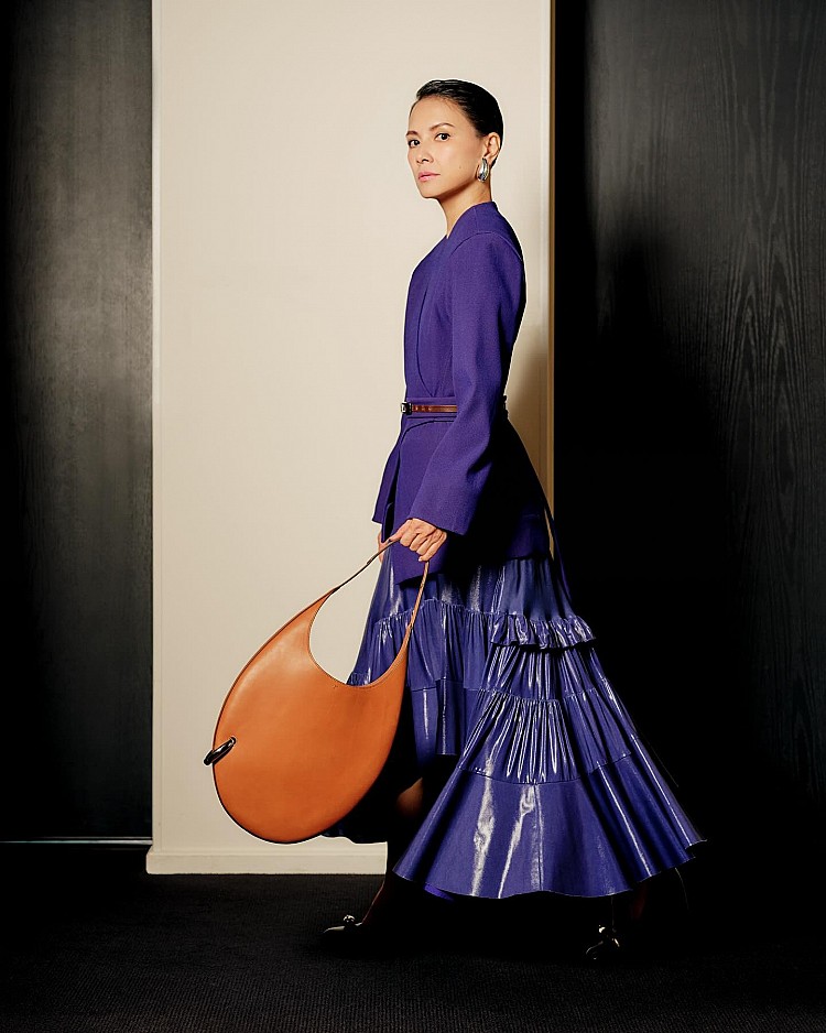 李心潔這套造型以Tory Burch不對稱剪裁夾克加上輕盈針織褶邊裙,紫藍色系在燈光下閃耀低調光澤,搭配棕色肩背包勾勒出幹練的氣場,這樣的配色與結構設計,簡潔之中帶著典雅,也讓李心潔看起來更顯年輕,是減齡穿搭的最佳範本。