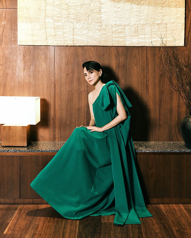 很多女生不敢嘗試特殊色,但若是懂得運用色彩學,像是上圖這種飽和的綠色,不僅襯托好氣色、顯得膚色更白,加上這套禮服以俐落的單肩剪裁搭配蝴蝶結垂墜設計,流暢的布料線條延伸至地面,讓身形更顯修長,也傳遞出屬於李心潔的從容與自信。