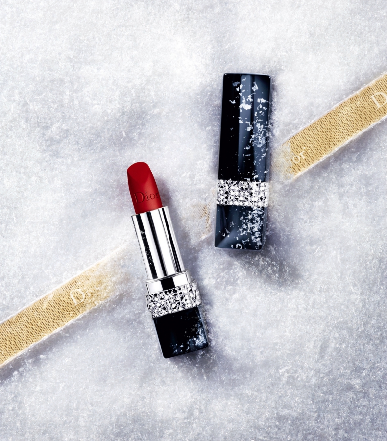 迪奧全球彩妝創意形象總監 Peter Philips重新演繹迪奧的傳奇紅唇,以雪花冰晶的切面形狀為靈感,將Dior藍星絲絨霧感唇膏#999柔霧正紅,瓶身上的經點藤格紋加上寶石切面妝點,讓藍星唇膏就像鑲嵌上一圈光環,閃耀如珠寶般的高貴奢華光感。