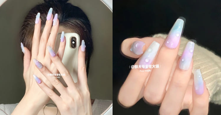 前面提到,紫色與藍色是今年美甲市場的重點色,然而要襯托泡泡的夢幻感,也很推薦搭配分子色調的漸層!猶如獨角獸光般的漸層粉暈,點綴上大小不一的泡泡,好似真的偷了人魚眼淚般,一上手便超吸睛!