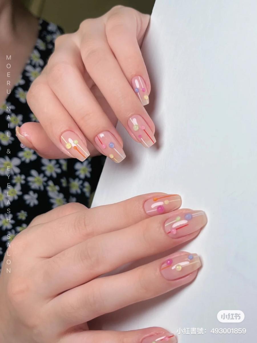 彩虹泡泡的俏皮,搭配線條再合適不過~透明的凝膠光療,以裸色、透白色打底,而後點綴上果凍感的彩色泡泡,同時搭配線條設計加分,讓手部視覺低調、雅致卻又不失年輕感!不僅夏天度假必須安排,見家長也不失禮呢~