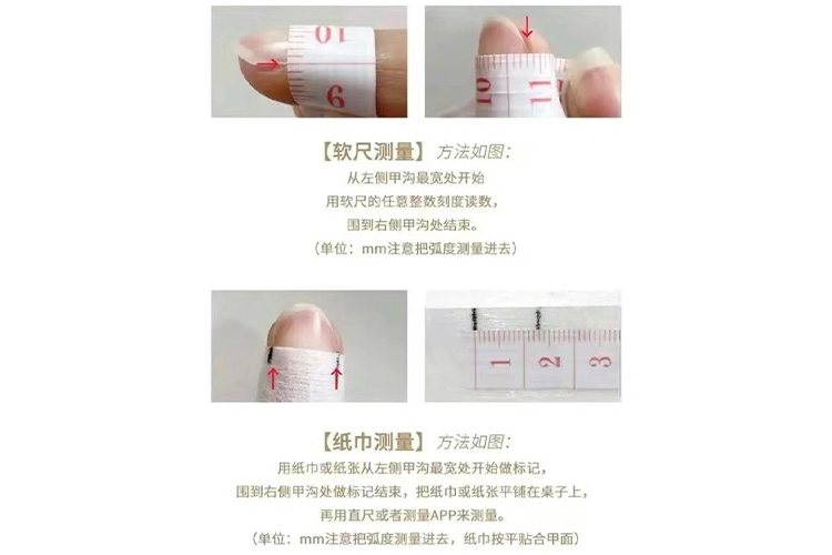 儂編這就不藏私跟大家分享兩種簡單甲片測量法,首先「軟尺測量法」只要把軟尺圍著甲溝最寬的地方,就能得出適合你的甲片大小;「紙巾測量法」也是一樣的道理,圍好後畫上記號,再平鋪桌上用尺測量,就完成囉!這兩種方法在測量時必須要是裸甲進行,而且一定要圍緊,才能買到符合自己的穿戴甲。