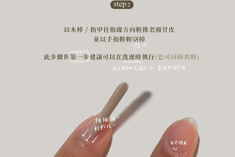 穿戴甲的店家一定都會附贈小木棒,用來將甘皮向後推,甘皮之所以會生長,是因為指甲周圍的皮膚太乾燥,為了不讓水分流失,硬繭厚皮就會變多,因此健康的甘皮是不需要去除的!修剪掉脫皮、肉次即可,如果是為了美觀,就建議10天進行一次就好,平常做足保濕習慣,也能讓甘皮不過度堆積喔。