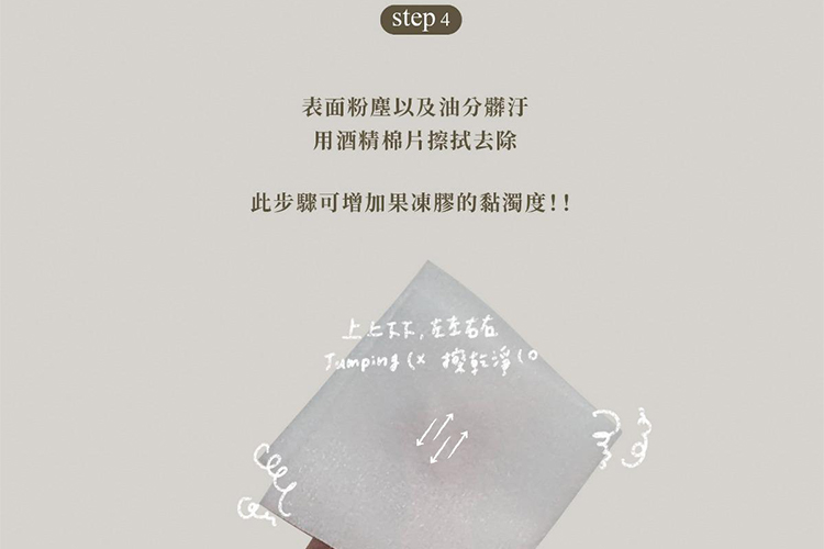 打磨完的指甲,表面會有很多粉塵及油汙,拿出酒精棉片上下左右來回的擦拭,確定乾淨後就稍微等酒精揮發一下,前面的四個步驟雖然有點麻煩,但這些前置作業都是為了讓甲片能緊緊黏在指甲上,畢竟想要美美的,就要付出耐心啊!