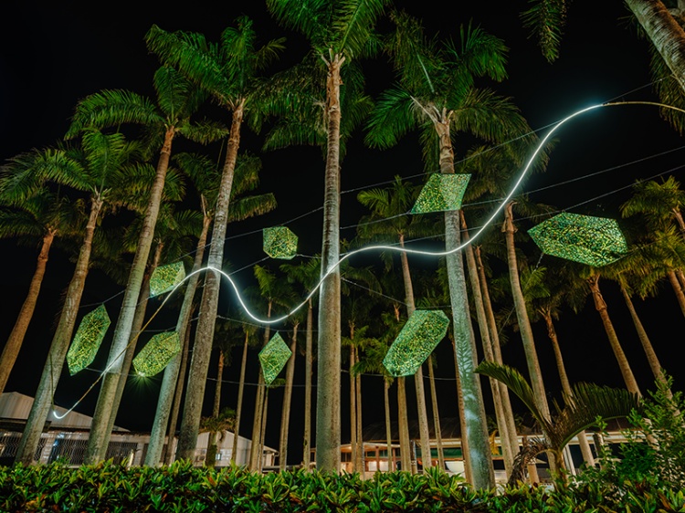 路瓦・里維拉的作品《沐光耀》,輕巧地懸浮在知本溫泉的棕櫚樹間,由金屬與透明織物交織而成,呈現如玉石般閃耀的形體。白天在陽光下閃爍微光,夜晚則發出柔和內光,彷彿一個有生命的有機體。作品色彩取自溫泉在岩石上留下的礦物痕跡——綠、青綠與赭石色,呼應地景,讓觀者彷彿置身夢境般的自然節奏之中。