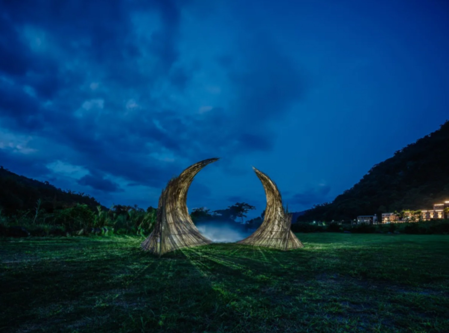 李蕢至的作品《氣鏡之門》位於台東知本溫泉山區,竹材構築出層疊山峰的造型,中央圓窗對望遠方山脈,象徵天地間的無聲對話。這扇門不僅是觀景框,更像通往內心與宇宙交流的入口。白天,光影在竹構間流動變幻;夜晚,燈光映照竹紋,霧氣繚繞,營造如夢似幻的氛圍。整體作品彷彿穿越時空的詩意門扉,帶領人們在光、水與自然中,感受靜謐而深刻的沉浸體驗。
