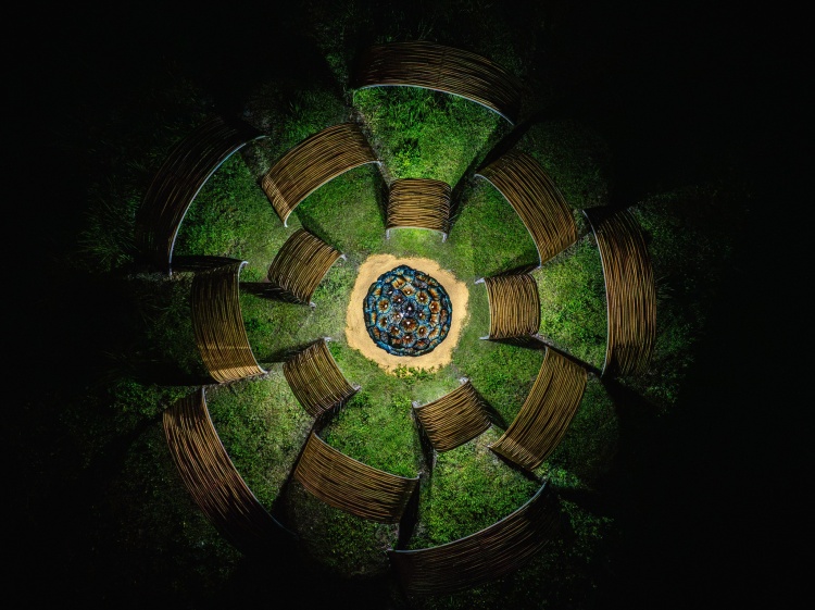米類・瑪法琉的作品《落憶》以線性時光為軸,融合創作場域中的萬物,呈現豐富的空間感知。作品運用當地植物生長,帶出感知的深度,透過文化敘事勾勒空間輪廓,自然元素如光影、雨水、風、氣息、種籽與溪流,無聲地落在土地上,形塑出具象與無形的生命交織。從神話時代的石生、竹生到族人的世代足跡,身體記憶在此相互融合,日夜閃耀,展現土地與文化的連結。