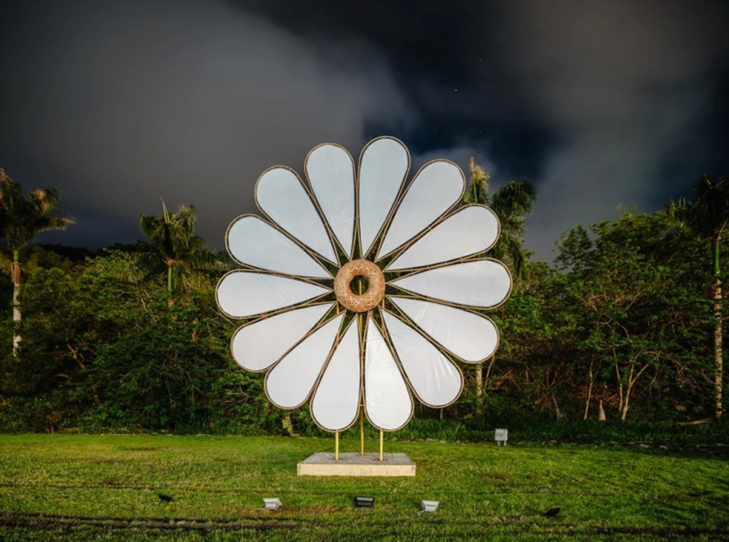 鄭元東的作品《沐光之花》,宛如夜晚綻放的神聖花朵,在知本溫泉的霧氣與日光中散發柔和光芒。作品回應知本獨特的水氣與光影,透過花的造型象徵泉水的流動與擴散。「泉」代表生命與靈性之源,「象」則結合形象與象徵意義。在這片充滿霧氣與泉水的台東土地上,花不只是自然植物,更是意識與記憶的延伸,邀請人們從日常喧囂中抽離,重新感受自然溫柔的光與力量。