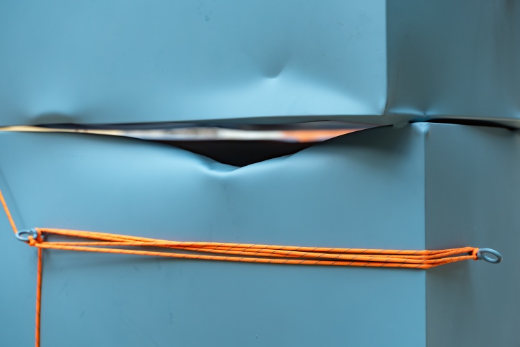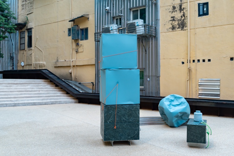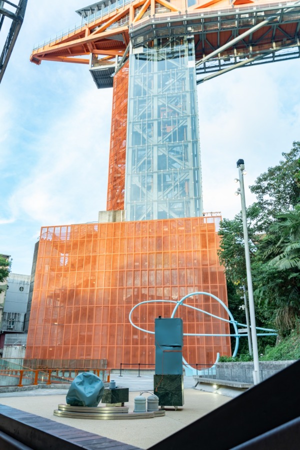 策展人陳晞說,當時藝術家一看到這個場地後,馬上就決定要在這邊做作品。被錘打、鍛敲的幾何立體雕塑,像是貨物般呼應著基隆塔的橋式起重機,「然而除了基隆塔,從那個三角形廣場,可以看到一棟棟長方形民間住宅的背後,有的補上鐵皮浪板,有的被漆上外接管線與牆面疊合......,在這個廣場中很多有意思的細節,被瑞謙運用在雕塑裡面。」