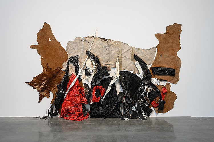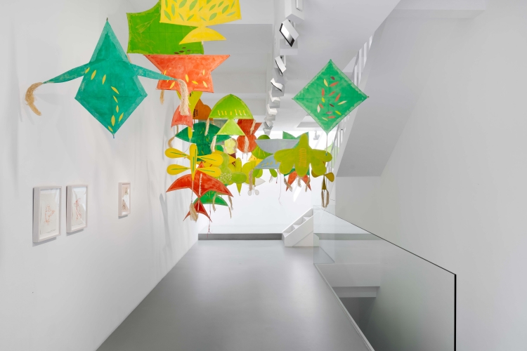 臺灣前輩藝術家陳幸婉近三十年來首次公開展出的《大地之歌 No.1》,以衣物布料與皮革構成作品結構,將日常材質轉化為承載生命痕跡的媒介,映照生與滅的循環關係。美國行為與錄像藝術先驅瓊.喬納斯(Joan Jonas)《風中一線》則以漂浮於空間中的紙質風箏,召喚風、身體與觀看之間的互動,使觀者在移動與凝視之間,重新感知自然的節奏與存在方式。