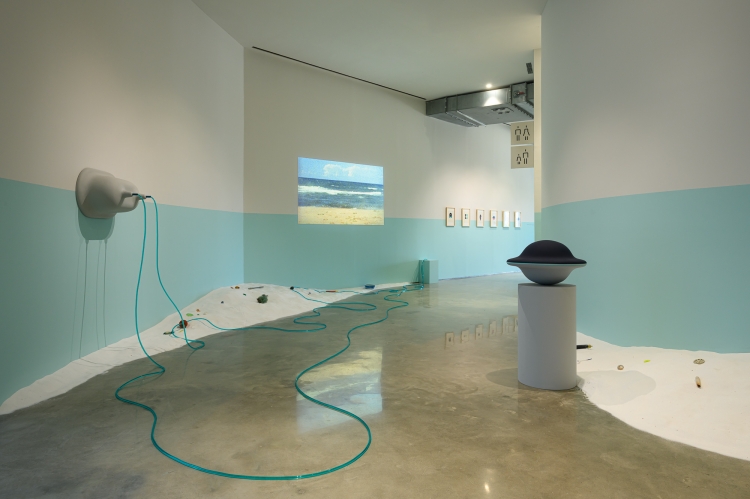 鈴木悠哉,〈在最後之物的世界〉,2025,混合媒材裝置_攝影、繪畫、影像、植物、沙、水、以水性樹脂製作的立體物件、壓克力顏料、保麗龍、鋼、木材、 馬達、海洋廢棄物_尺寸依空間場合而定,藝術家自藏,臺中市立美術館委託創作。攝影:ANPIS FOTO 王世邦