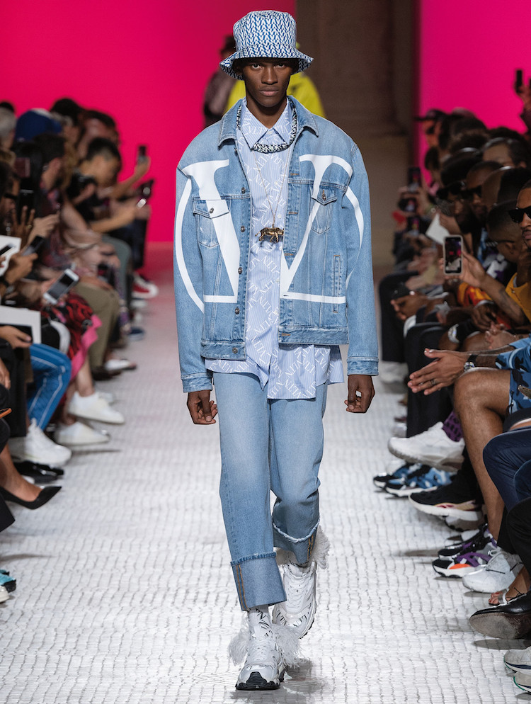 除了這四字母外,品牌創意總監在這次的設計中解構了 Valentino 經典的大 V 字樣,這樣宛如塗鴉感的字樣創作,讓整體服裝風格呈現出別具個性的樣貌,劉以豪運用 VLNT 印花襯衫與大 V 字樣牛仔外套混搭,以 Double Logo 的方式做搭配,整體不僅不過於突兀,反而多了年輕氣息。