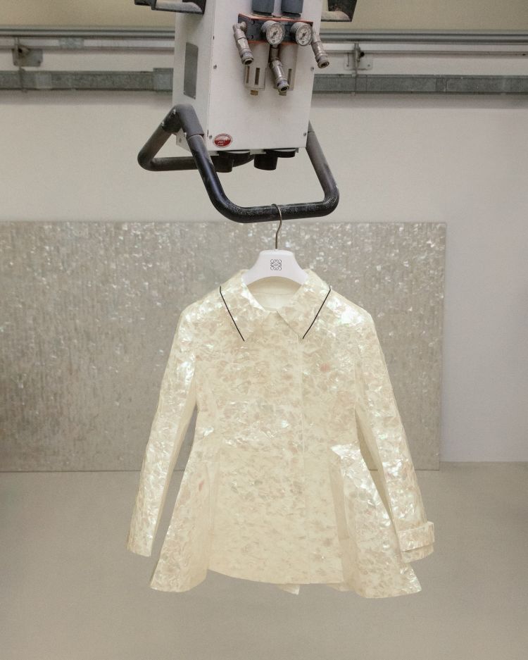 除了透過展覽傳遞品牌「工藝」之美,Jonathan Anderson 在 2025 春夏女裝發布秀場上,更展現了另一個突破性的野心與技術,利用珍珠母貝切割、打磨出偏光色澤,呈現閃亮的「珍珠母貝洋裝」,以及精湛的羽毛印刷上衣,再一次,將 LOEWE 的工藝推升至更高的層次。從一個西班牙製革工匠品牌,到全面性的時裝品牌,LOEWE 無疑是最具成功蛻變的百年歷史品牌典範之一。