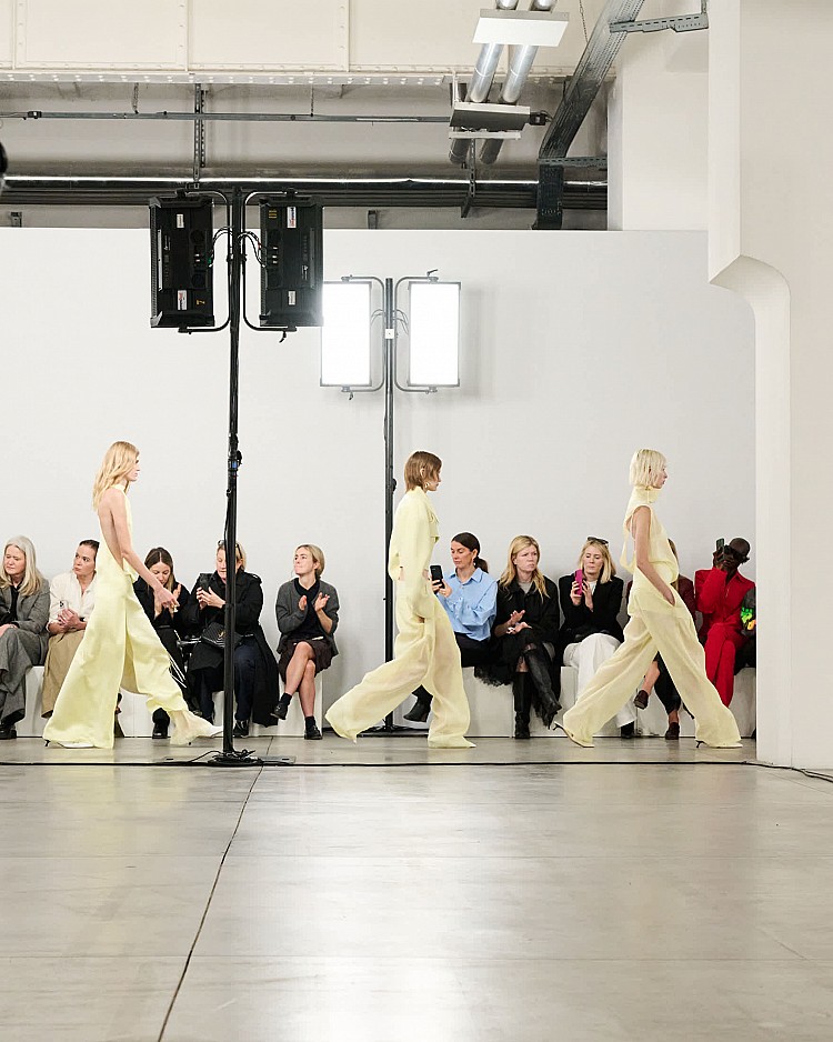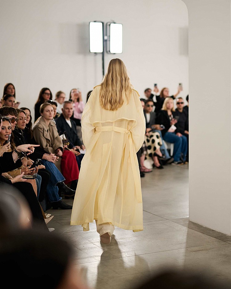 本季核心概念「流動與輕盈」貫穿全場。創意總監Grazia Malagoli將歐根紗、雙面羊毛與柔軟皮革巧妙融合,透過對光線與動作的呼應,呈現出如水般的飄逸動感。經典風衣、透視長褲與輕盈內裡,都被重新詮釋為可隨身體律動而變化的作品。這份流動的設計語言,不僅象徵女性在現代社會中柔中帶剛的力量,也展現Sportmax對「功能與詩意共存」的深刻理解。