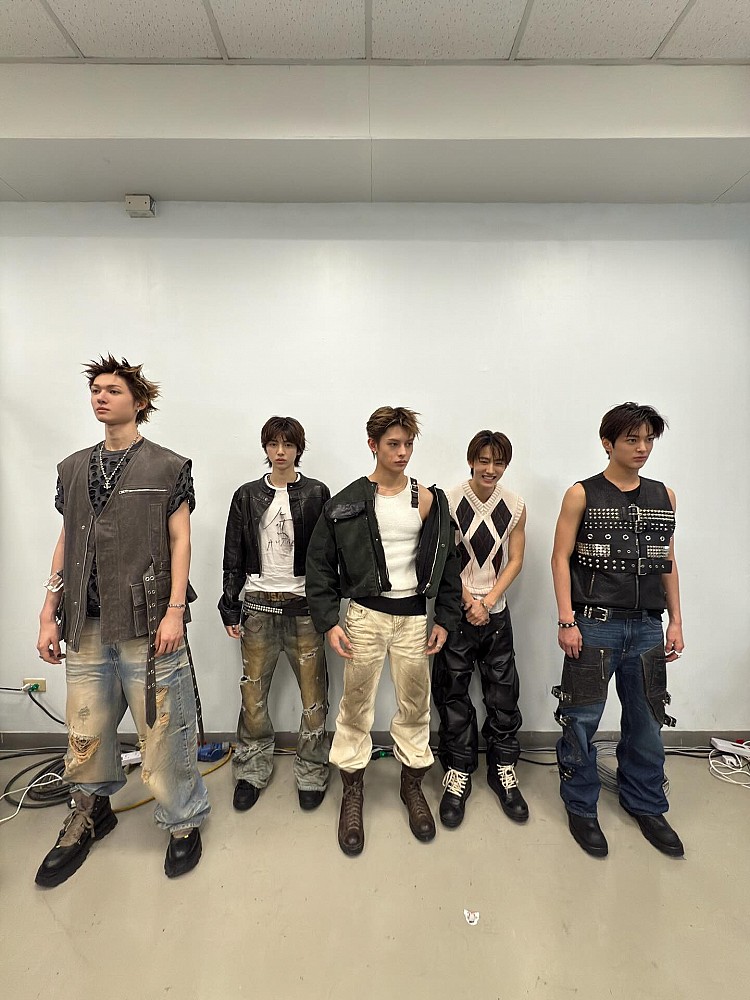 在這組後台合照中,Cortis 全員以黑、灰為主調的造型亮相,展現濃厚的暗黑機能、Y2K穿搭的風格。短版外套、刷舊丹寧、工裝褲與拼接長褲交錯運用,搭配頭帶、毛帽、手套與護臂等配件點綴,內搭白T或圖騰上衣作為對比,堆疊出豐富視覺層次,讓整體造型在單一色系中依然充滿細節