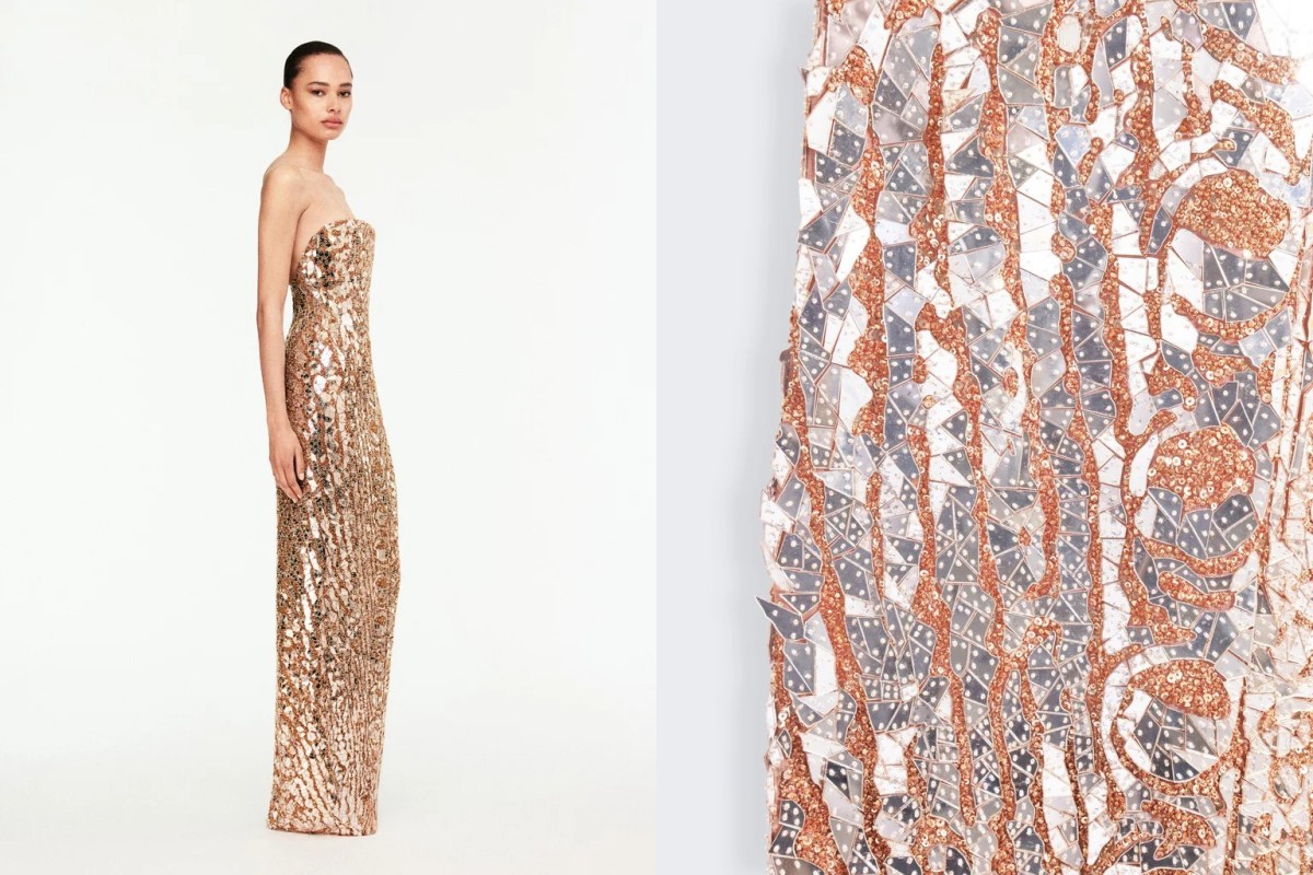 至於這件禮服價值何在,則可從細節中一探究竟。除了禮服本身以純真絲面料製作外,整件服裝更運用仿古銀色鏡面亮片與珠飾刺繡,透過全手工縫製,呈現出宛如羽毛般的層次意象。整體設計奢華而不失典雅,完美展現 Schiaparelli 高超的訂製工藝。