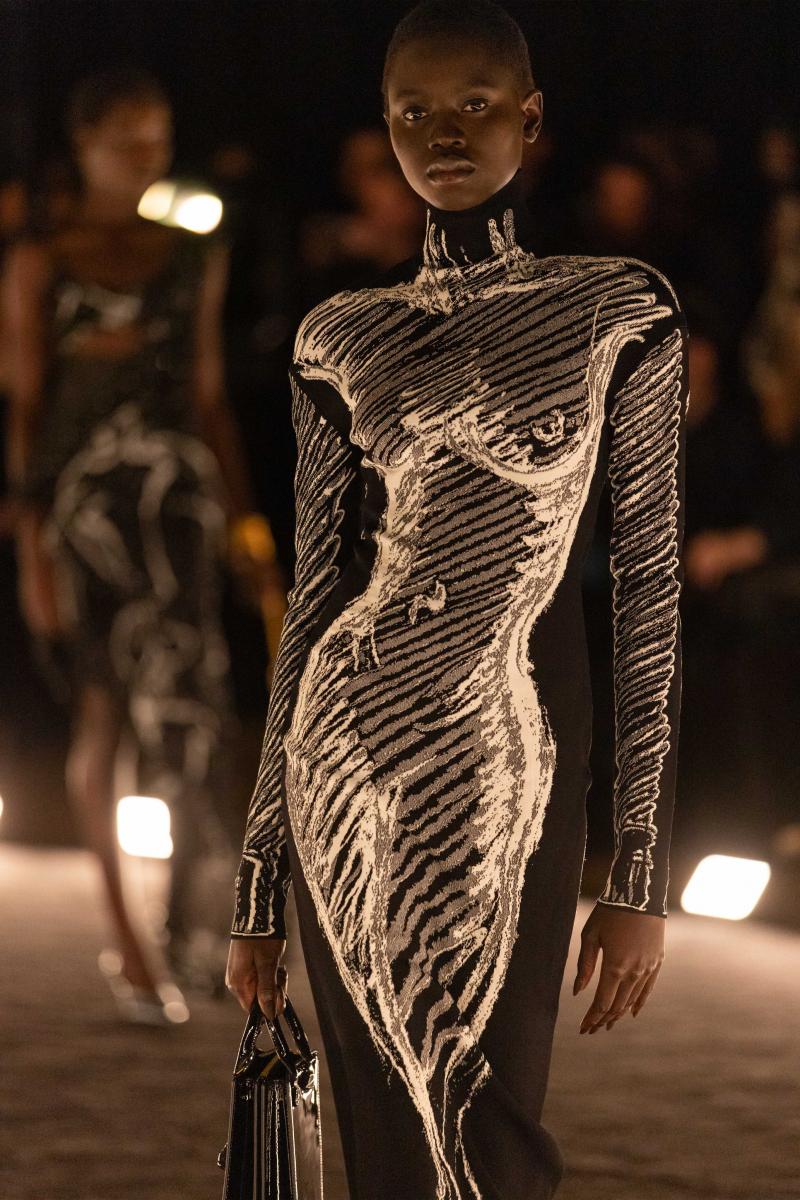 Allday Project 成員 Annie 所穿著的禮服,來自以超現實主義聞名的品牌 Schiaparelli。在解析這套服裝之前,不妨先簡單回顧品牌的歷史。Schiaparelli 於 1927 年由義大利裔設計師 Elsa Schiaparelli 於巴黎創立,她是 20 世紀時裝史中最具實驗精神的人物之一,率先將超現實主義藝術引入服裝設計,並與多位藝術家合作,將眼睛、嘴唇、骨骼與人體藝術錯視轉化為時裝語言,徹底顛覆了當時對女性優雅與高級時裝的想像。儘管品牌於 1950 年代一度沉寂,但 Schiaparelli 早已奠定「時裝即藝術」的核心精神。