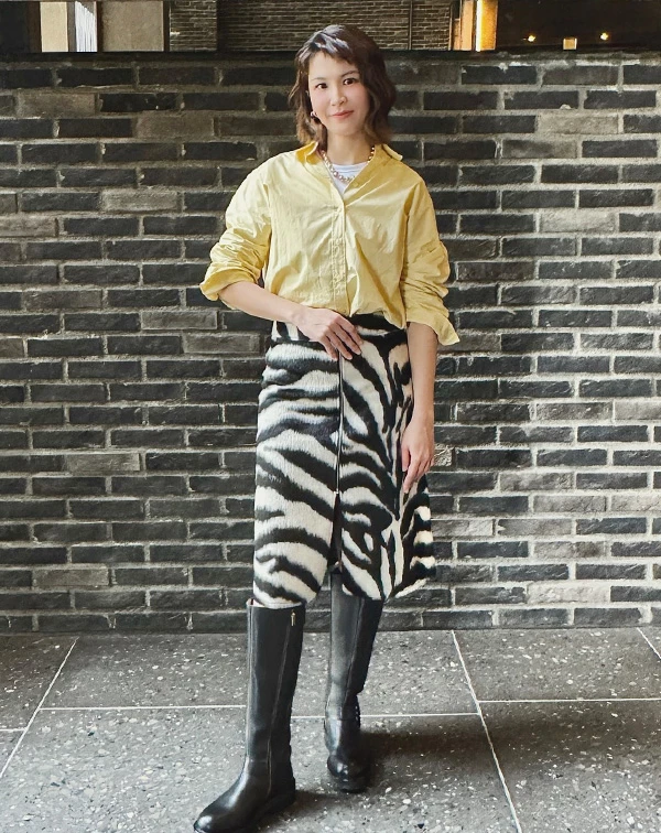 這套穿搭精準展現了曾沛慈運用「裙裝」的減齡功力。她巧妙選擇斑馬紋毛呢裙作為視覺核心,利用裙子大膽的圖騰打破沉悶,毛呢材質的硬挺度更自然地修飾了身形曲線。上半身則搭配明亮的檸檬黃襯衫,捲起袖口的隨性層次不僅瞬間提亮膚色,更平衡了裙子的繁複感,完美演繹「上簡、下繁」的層次美學。