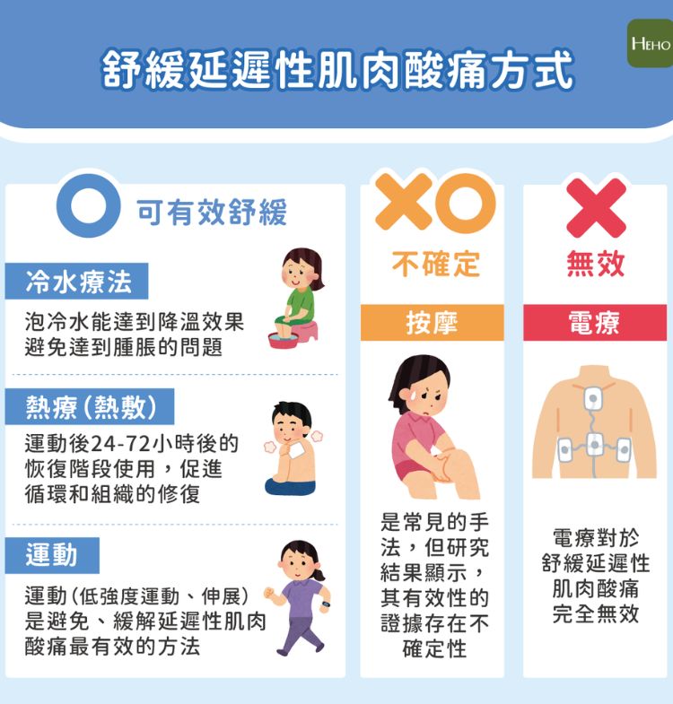 至於緩解延遲性肌肉的方法,包含冷水療法、熱療、按摩以及運動,其中又以運動最有效果。