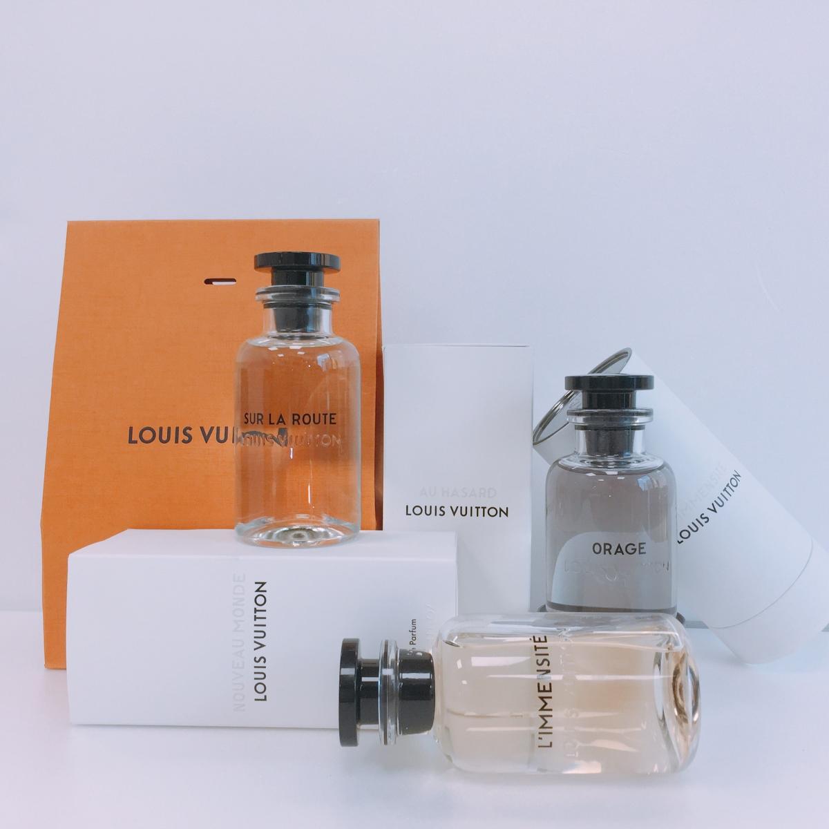 特別的是從每個瓶子的蓋頂來分辨男香與女香。男香上的LV標誌以鍍鋅冷金屬刻印,女香系列的標記則是鍍黃銅。另外在包裝盒上,男香使用灰與銀標記,女香系列的包裝採用細緻的金色標記。